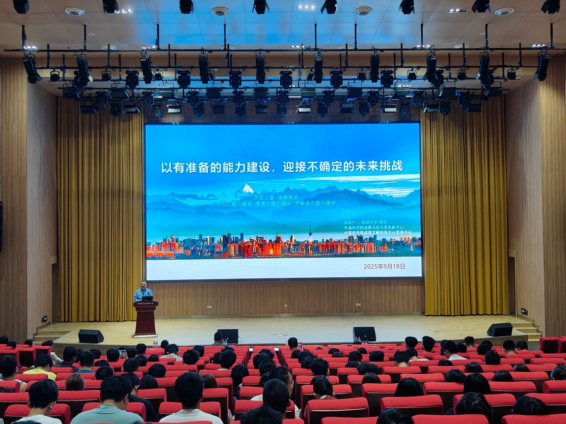中国科学院成都分院分党组副书记、系统单位党委副书记曲建升作题为“以有准备的能力建设,迎接不确定的未来挑战”的思政专题报告。他从科技史演进切入,回顾三百年世界科技中心变迁与中西方历史进程,带领同学们缅怀革命先烈,并聚焦中国科学院“抢占科技制高点”的核心使命,提出三点能力建设要求:个人能力、学者能力与贡献者能力。结合自身科研经历,他勉励新生勤思善悟、勇创新知、担当大任,努力成为科技强国的中坚力量。