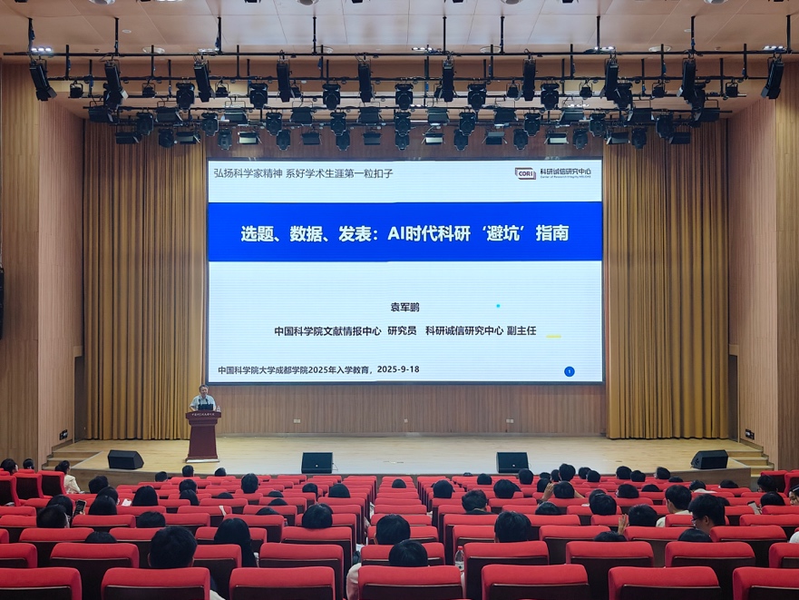 中国科学院大学心理健康教育中心主任肖斌带来“从学习到研究的心理能力升级”专题讲座,为新生科研生活奠定健康的心理基础。中国科学院文献情报中心研究员、科研诚信研究中心副主任袁军鹏以“选题、数据、发表:AI时代科研‘避坑’指南”为题,借助典型案例与数据,系统讲解科研诚信的重要性与中国科学院相关治理体系,从选题原则、过程诚信到发表规范,全面引导新生树立严谨治学态度。